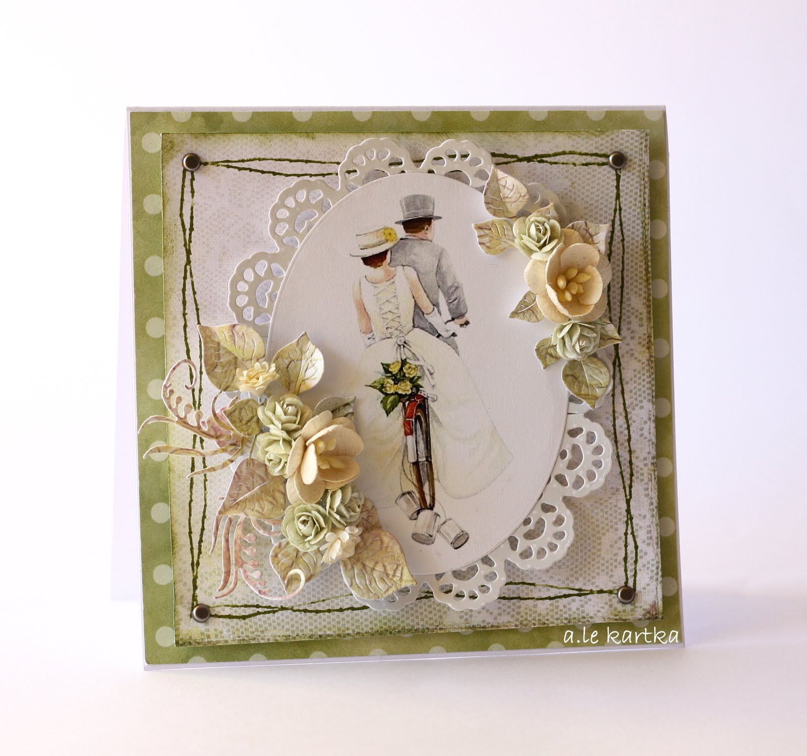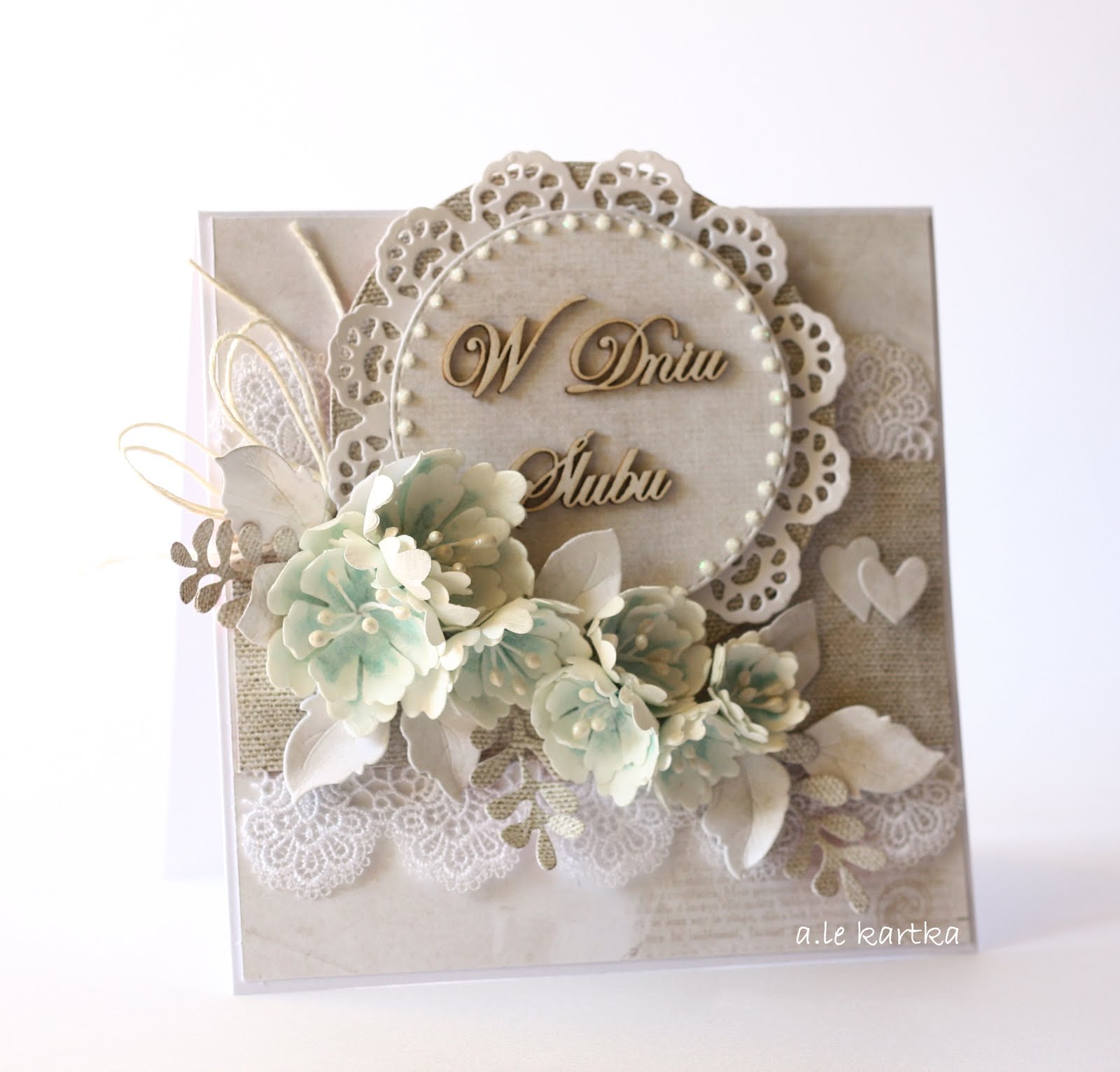 Przygotowując kartkę na ślub, postanowiłam wykorzystać wiedzę z warsztatów i chciałam stworzyć kartkę w konkretnym stylu, ale w trakcie pracy postanowienie słabło. Skończyło się na freestylu :))